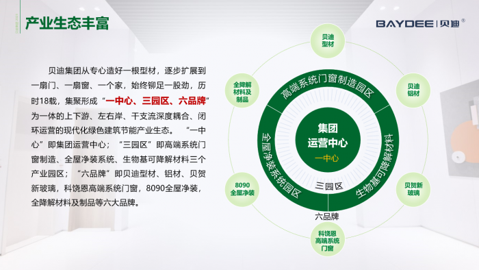 貝迪將品牌建設(shè)融入現(xiàn)代化產(chǎn)業(yè)體系建設(shè),做強(qiáng)做精服務(wù)品牌。旗下目前擁有貝迪型材、貝迪鋁材、科饒恩超低能耗門窗、8090貝迪全屋定制、特創(chuàng)生物科技等品牌。一直以來,貝迪積極探索創(chuàng)新發(fā)展路徑,高標(biāo)準(zhǔn)打造企業(yè)品牌,進(jìn)一步深挖多品牌內(nèi)涵,通過講好多品牌故事,持續(xù)完善豐富營銷策略渠道,不斷創(chuàng)新商業(yè)模式,進(jìn)一步推動(dòng)以貝迪規(guī)模優(yōu)勢、品牌優(yōu)勢、服務(wù)優(yōu)勢等整合市場資源,提高品牌集中度,增強(qiáng)品牌國際影響力,提高市場占有率。