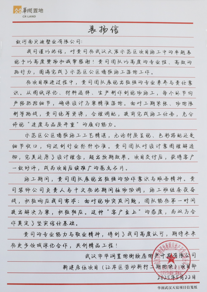 面對中寰悅府項目與武漢天宸項目工期緊張、場地限制等挑戰(zhàn)。為確保項目順利推進,我司精挑細選出一支涵蓋技術(shù)、施工的項目骨干團隊。在科饒恩裝飾公司負責人馬千文帶領(lǐng)下,自進場后,從圖紙深化、材料選樣、生產(chǎn)制作到現(xiàn)場施工,每個環(huán)節(jié)嚴格把控,最終提前完成施工任務。華潤置地在表揚信中特別肯定了科饒恩裝飾團隊的專業(yè)素養(yǎng)和擔當精神,并高度稱贊了我司“速度與品質(zhì)并重”的履約能力,墻板精湛工藝完美還原了設計效果,在項目交付后,贏得了客戶的一致好評,為項目后續(xù)推廣提供了明星亮點。
